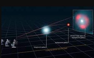 Figura 14. Lente gravitacional. En astrofísica una lente gravitatoria, también denominada lente gravitacional, se forma cuando la luz procedente de objetos distantes y brillantes como quasares se curva alrededor de un objeto masivo situado entre el objeto emisor y el receptor.