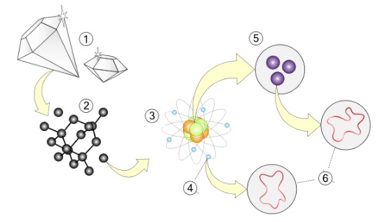 Figura 16. Niveles de aumento de la materia: 1. Materia, 2. Estructura molecular, 3. Átomos, 4. Electrones, 5. Quarks(protones y neutrones), 6. Cuerdas.